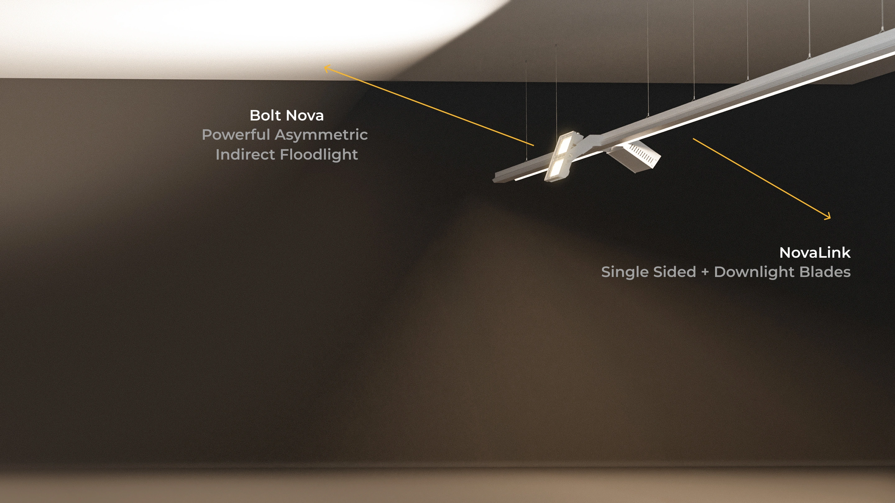 NovaLink and Bolt Nova are designed to work as one integrated system. NovaLink establishes the structural framework and broad ambient illumination, while Bolt Nova adds layers of focused, high-output lighting. The result is a cohesive platform that simplifies specification, reduces fixture clutter, and delivers consistent performance across large-scale environments.